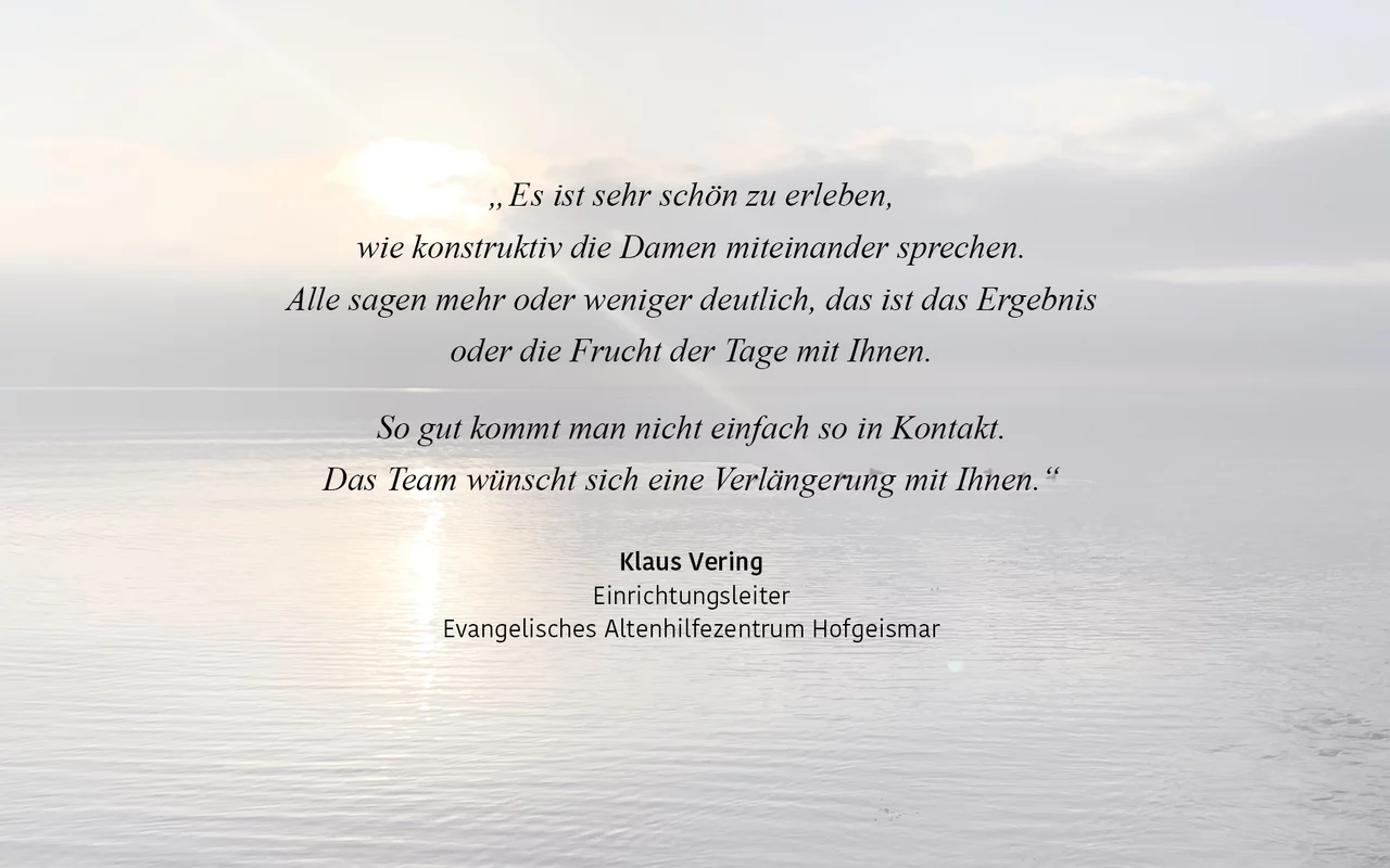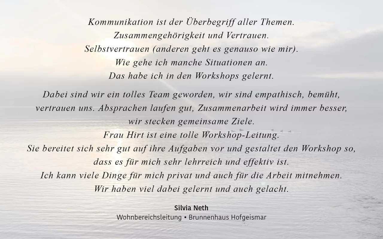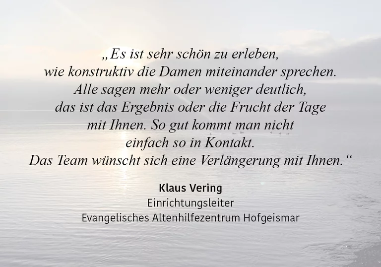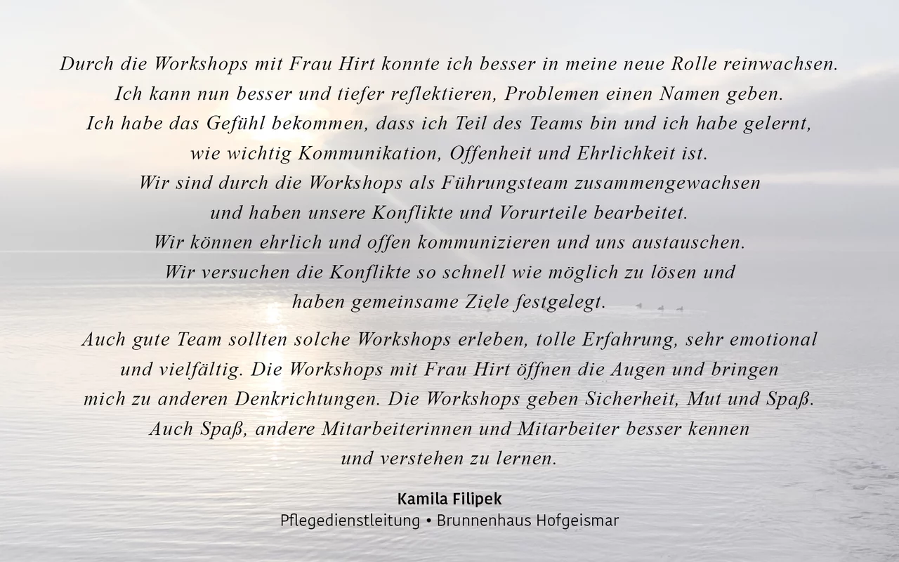 Ich bin da zum Start eines neuen Teams, für vertrauensbildende Maßnahmen, zur Verbesserung der Zusammenarbeit oder in Konfliktsituationen.