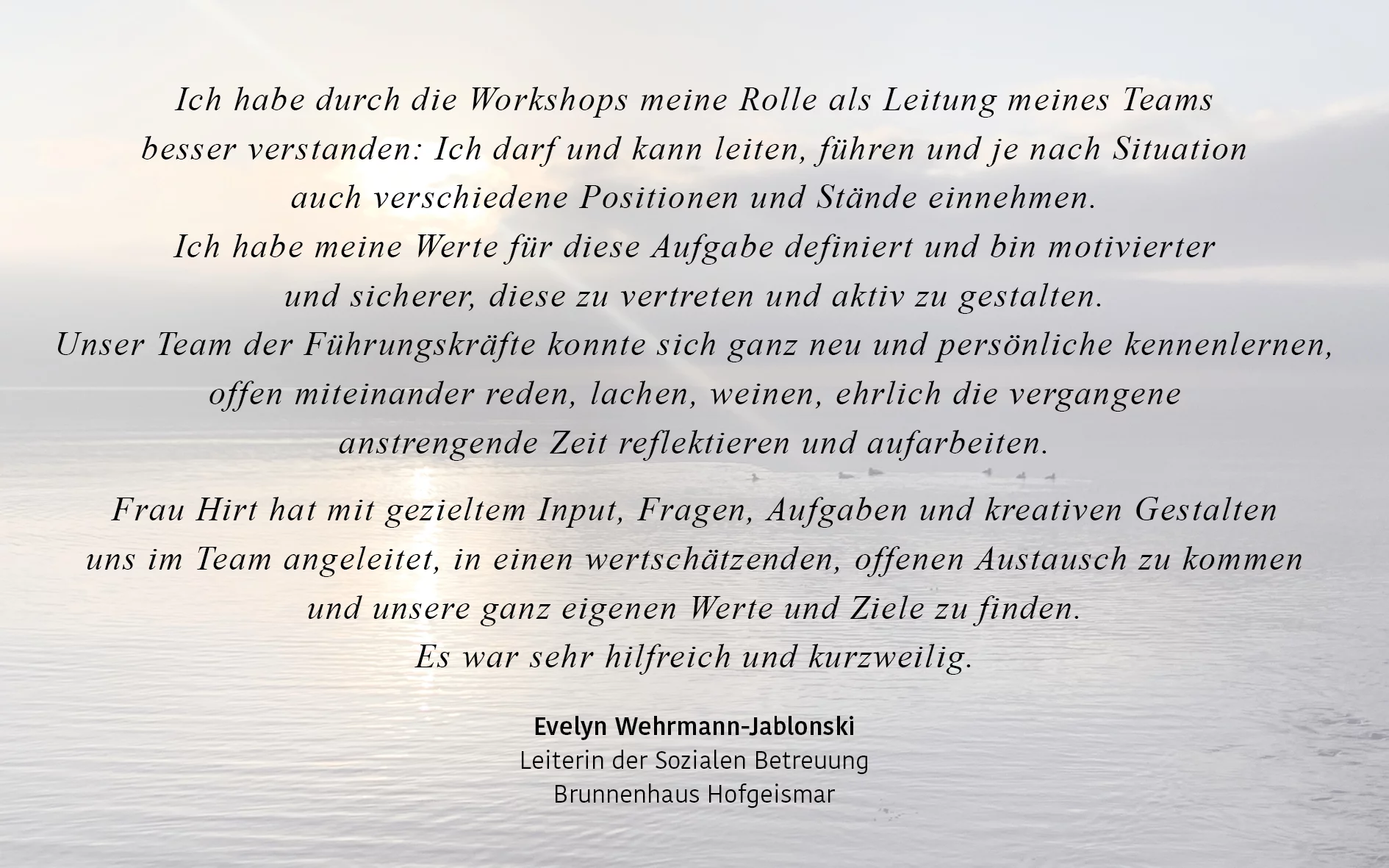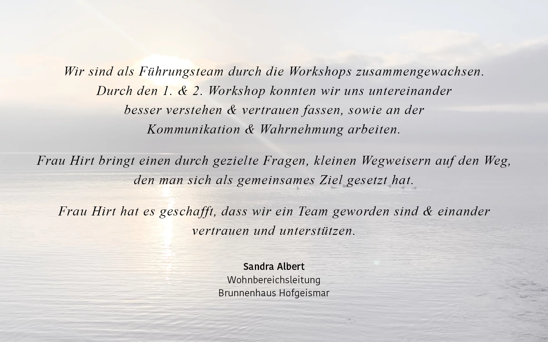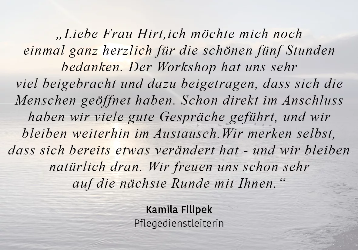 Ich bin da zum Start eines neuen Teams, für vertrauensbildende Maßnahmen, zur Verbesserung der Zusammenarbeit oder in Konfliktsituationen.